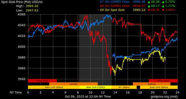 Giá vàng tương lai giao tháng 12/2025 trên sàn Comex New York giảm mạnh 97,9 USD, tương ứng giảm 2,41% xuống mức 3.972,6 USD/ounce.