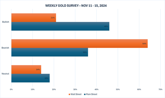 Tuần này, 14 nhà phân tích đã tham gia Khảo sát vàng của Kitco News và đợt bán tháo mạnh trong tuần này đã đẩy phần lớn Phố Wall vào triển vọng bi quan. Chỉ có ba chuyên gia, hay 21%, dự kiến giá vàng sẽ tăng trong tuần tới, trong khi chín nhà phân tích, hay 64%, dự đoán giá kim loại quý này sẽ giảm. Hai nhà phân tích còn lại, chiếm 14% tổng số, dự kiến giá vàng sẽ có giai đoạn củng cố.