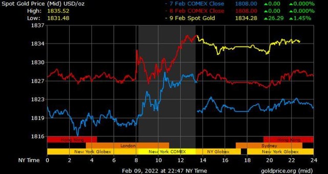 Giá vàng tương lai giao tháng 4/2022 trên sàn Comex New York tăng 8,7 USD lên 1.836,6 USD/ounce.
