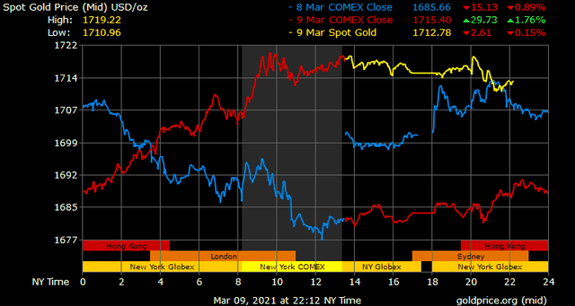 Trên thị trường vàng thế giới, giá vàng giao ngay chốt phiên đêm qua tại Mỹ tăng 33,5 USD lên 1.716,4 USD/ounce. Sang phiên châu Á sáng nay, giá vàng hạ nhiệt và lùi về gần 1.710 USD/ounce.