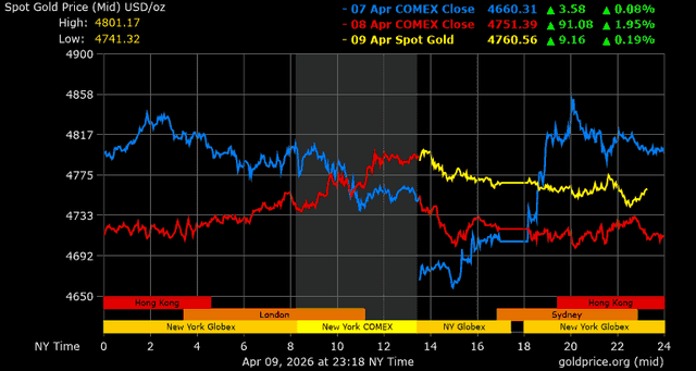 Trên thị trường vàng thế giới, giá vàng giao ngay chốt phiên hôm qua tại Mỹ tăng 46,4 USD, tương ứng tăng 0,98% lên mức 4.765,4 USD/ounce. Sang phiên châu Á sáng nay, giá vàng đảo chiều giảm nhẹ 4,2 USD xuống mức 4.761,2 USD/ounce.