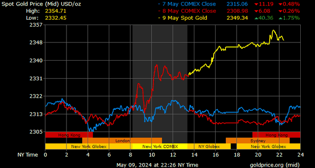 Giá vàng tương lai giao tháng 6/2024 trên sàn Comex New York tăng 18 USD, tương ứng tăng 0,78% lên mức 2.340,3 USD/ounce.