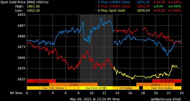 Giá vàng giảm mạnh và có thời điểm hợp đồng tương lai tháng 6/2022 giảm mạnh nhất 29,2 USD. Việc bán tháo mạnh mẽ trên thị trường tài chính và kim loại quý này là để phản ứng với hoạt động gần đây của Cục Dự trữ Liên bang cũng như triển vọng của Fed cho 2 cuộc họp FOMC tiếp theo.