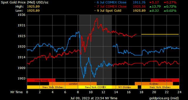 Giá vàng tương lai giao tháng 8/2023 trên sàn Comex New York tăng 17,1 USD, tương ứng tăng 0,89% lên 1.932,5 USD/ounce.