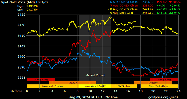 Giá vàng tương lai giao tháng 8/2024 trên sàn Comex New York tăng 9,9 USD, tương ứng tăng 0,41% lên mức 2.432,1 USD/ounce.