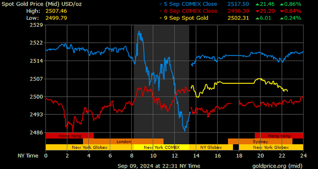 Trên thị trường vàng thế giới, giá vàng giao ngay chốt phiên hôm qua tại Mỹ tăng 8,8 USD lên 2.506,4 USD/ounce. Sang phiên châu Á sáng nay, giá vàng đảo chiều giảm 4,1 USD xuống 2.502,3 USD/ounce.