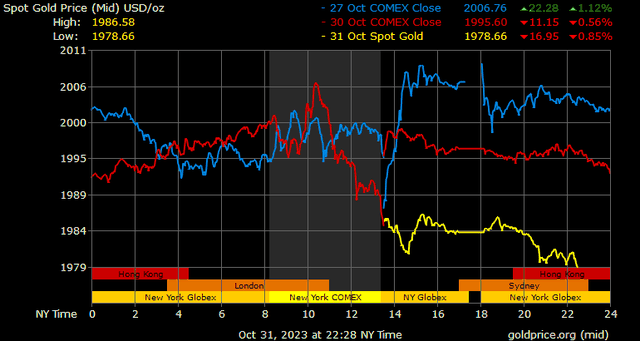 Giá vàng tương lai giao tháng 12/2023 trên sàn Comex New York giảm 11,3 USD, tương ứng giảm 0,56% xuống 1.994,3 USD/ounce.