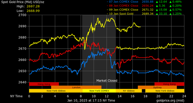 Giá vàng tương lai giao tháng 2/2025 trên sàn Comex New York tăng 24,2 USD, tương ứng tăng 0,9% lên mức 2.715 USD/ounce.
