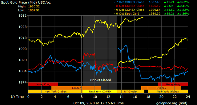Trên thị trường vàng thế giới, giá vàng giao ngay chốt phiên cuối tuần tại Mỹ tăng 36,7 USD lên 1.930,6 USD/ounce. Giá vàng tương lai giao tháng 11 trên sàn Comex New York tăng 41 USD lên 1.932 USD/ounce.