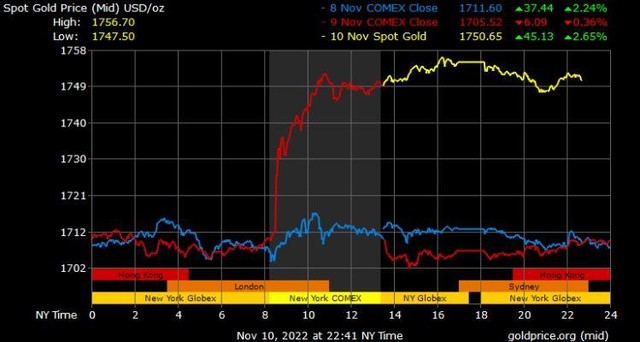 Giá vàng tương lai giao tháng 12/2022 trên sàn Comex New York tăng 40 USD lên mức 1.753,7 USD/ounce.