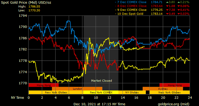 Trên thị trường vàng thế giới, giá vàng giao ngay chốt phiên đêm qua tại Mỹ tăng 7,3 USD lên 1.782,9 USD/ounce. Giá vàng tương lai giao tháng 1/2022 trên sàn Comex New York tăng hơn 6 USD lên 1.781,9 USD/ounce.