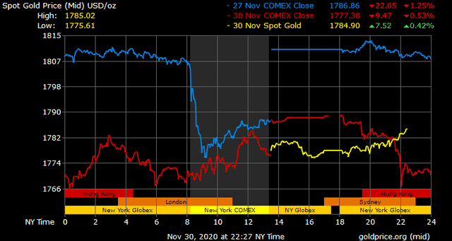 Giá vàng tương lai giao tháng 1/2021 trên sàn Comex New York tăng 5,5 USD lên 1.783,5 USD/ounce.