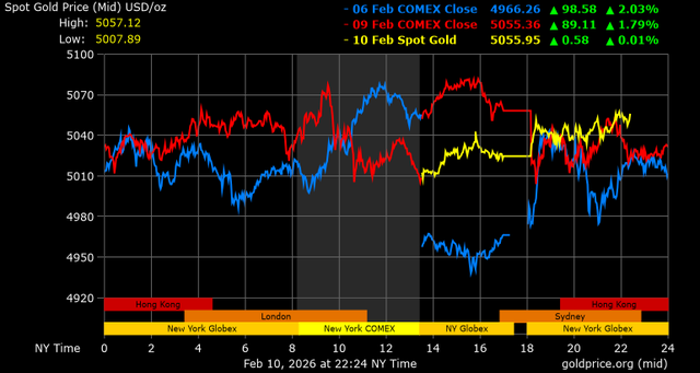 Trên thị trường vàng thế giới, giá vàng giao ngay chốt phiên hôm qua tại Mỹ giảm 32,7 USD, tương ứng giảm 0,65% xuống mức 5.025,1 USD/ounce. Sang phiên châu Á sáng nay, giá vàng đảo chiều tăng 32,4 USD lên mức 5.057,5 USD/ounce.