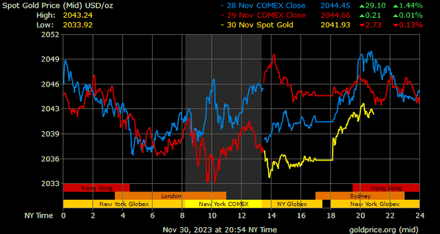 Dữ liệu kinh tế của Hoa Kỳ vừa công bố, bao gồm cả số liệu lạm phát PCE như mong đợi, không có tác động đáng kể đến vàng. Trong khi đó, Trung Quốc nhận được một số tin tức kinh tế tồi tệ hơn khi chỉ số quản lý mua hàng sản xuất chính thức (PMI) tháng 11 giảm xuống 49,4 từ mức 49,5 trong tháng 10, đánh dấu tháng thứ hai liên tiếp dưới 50; PMI dịch vụ giảm xuống 49,3 từ mức 50,1 trong tháng trước. Những dữ liệu này cho thấy giá kim loại quý giảm bởi nhu cầu yếu hơn đến từ nền kinh tế lớn thứ hai thế giới.