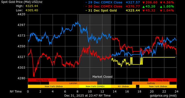 Trên thị trường vàng thế giới, giá vàng giao ngay chốt phiên hôm qua tại Mỹ giảm 16,8 USD, tương ứng giảm 0,39% xuống mức 4.322,6 USD/ounce.