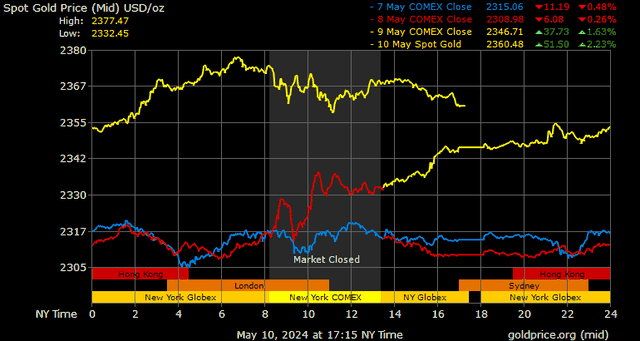Giá vàng tương lai giao tháng 6/2024 trên sàn Comex New York tăng 34,7 USD, tương ứng tăng 1,48% lên mức 2.375 USD/ounce.