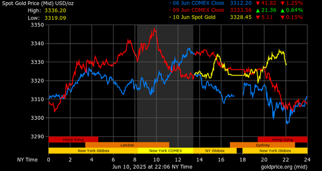 Giá vàng tương lai giao tháng 8/2025 trên sàn Comex New York giảm 11,5 USD, tương ứng giảm 0,34% xuống mức 3.343,4 USD/ounce.