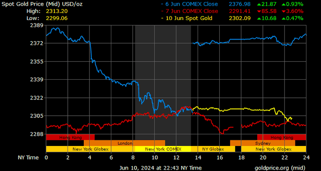 Giá vàng tương lai giao tháng 8/2024 trên sàn Comex New York tăng nhẹ 2 USD, tương ứng tăng 0,09% lên mức 2.327 USD/ounce.