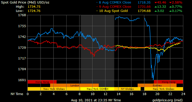 Giá vàng tương lai giao tháng 9 trên sàn Comex New York tăng 3,3 USD lên 1.732,3 USD/ounce.