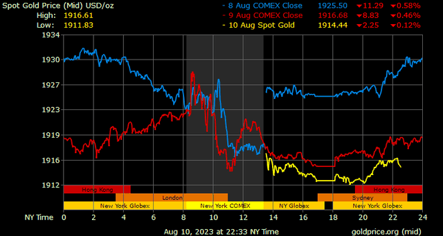 Trên thị trường vàng thế giới, giá vàng giao ngay chốt phiên hôm qua tại Mỹ giảm 1,6 xuống 1.911,8 USD/ounce. Sang phiên châu Á sáng nay, giá vàng đảo chiều hồi nhẹ lên mức 1.913,6 USD/ounce.