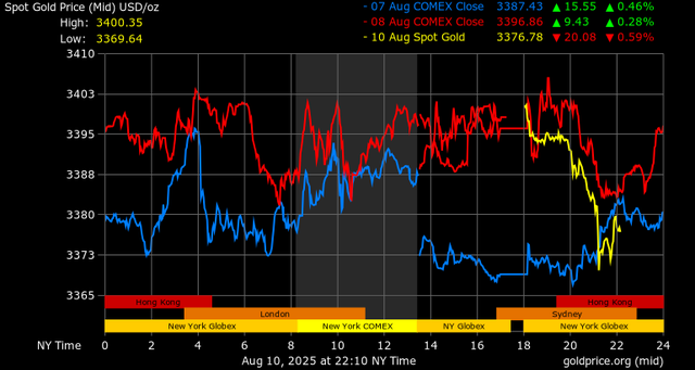 Trên thị trường vàng thế giới, giá vàng giao ngay chốt phiên cuối tuần qua tại Mỹ tăng nhẹ 1,9 USD lên mức 3.397,8 USD/ounce. Sang phiên châu Á sáng nay, giá vàng đảo chiều giảm 22,8 USD xuống 3.375 USD/ounce.