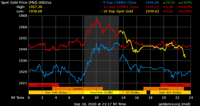 Trên thị trường vàng thế giới, giá vàng giao ngay chốt phiên đêm qua tại Mỹ tăng 0,4 USD lên 1.946,6 USD/ounce. Sang phiên châu Á sáng nay, giá vàng giảm về gần 1.937 USD/ounce. Giá vàng tương lai giao tháng 10 trên sàn Comex New York giảm 19,4 USD xuống 1.936,6 USD/ounce.