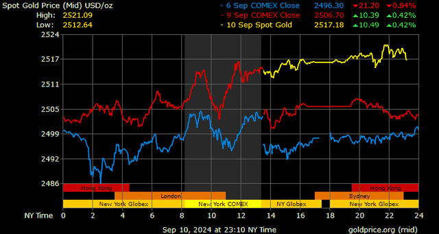 Trên thị trường vàng thế giới, giá vàng giao ngay chốt phiên hôm qua tại Mỹ tăng 10,3 USD lên 2.516,7 USD/ounce. Sang phiên châu Á sáng nay, giá vàng tiếp tục tăng nhẹ 1,7 USD lên 2.518,4 USD/ounce.