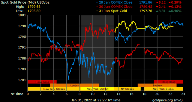 Giá vàng tương lai giao tháng 3/2022 trên sàn Comex New York tăng chưa đến 1 USD lên 1.796,6 USD/ounce.
