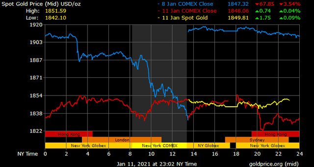 Trên thị trường vàng thế giới, giá vàng giao ngay chốt phiên đêm qua tại Mỹ giảm 6,6 USD xuống 1.843,4 USD/ounce. Sang phiên châu Á sáng nay, giá vàng nhích lên trên 1.850 USD/ounce.