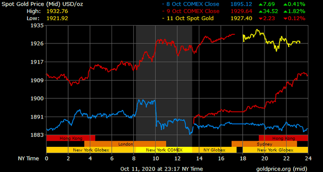 Trên thị trường vàng thế giới, giá vàng giao ngay chốt phiên cuối tuần qua tại Mỹ tăng 36,7 USD lên 1.930,6 USD/ounce. Sang phiên châu Á sáng nay, giá vàng giảm nhẹ xuống gần 1.927 USD/ounce. Giá vàng tương lai giao tháng 11 trên sàn Comex New York tăng 7,3 USD lên 1.929 USD/ounce.