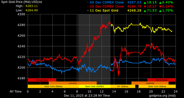 Trên thị trường vàng thế giới, giá vàng giao ngay chốt phiên hôm qua tại Mỹ tăng 50,6 USD, tương ứng tăng 1,2% lên mức 4.279,3 USD/ounce. Sang phiên châu Á sáng nay, giá vàng đảo chiều giảm 10,8 USD xuống 4.268,5 USD/ounce.