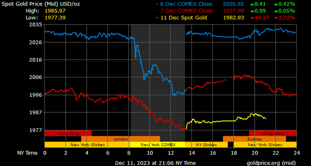 Giá vàng tương lai giao tháng 2/2024 trên sàn Comex New York giảm 20,8 USD, tương ứng giảm 1,03% xuống 1.993,7 USD/ounce.