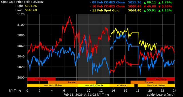 Trên thị trường vàng thế giới, giá vàng giao ngay chốt phiên hôm qua tại Mỹ tăng 59,2 USD, tương ứng tăng 1,18% lên mức 5.084,3 USD/ounce. Sang phiên châu Á sáng nay, giá vàng đảo chiều giảm 22,1 USD lên mức 5.062,2 USD/ounce.