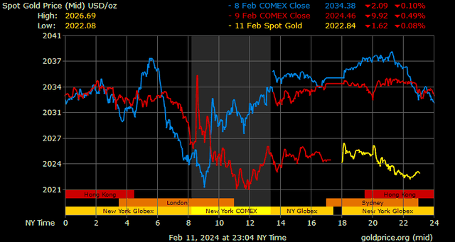 Giá vàng tương lai giao tháng 4/2024 trên sàn Comex New York giảm 9,2 USD, tương ứng giảm 0,45% xuống mức 2.038,7 USD/ounce.