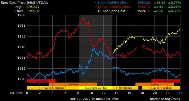 Giá vàng tương lai giao tháng 6/2022 trên sàn Comex New York tăng 2,6 USD lên 1.948,2 USD/ounce.