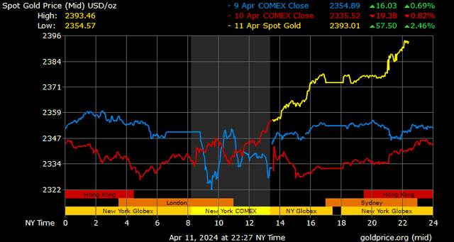 Trên thị trường vàng thế giới, giá vàng giao ngay chốt phiên hôm qua tại Mỹ tăng 38,4 USD lên 2.372,3 USD/ounce. Sang phiên châu Á sáng nay, giá vàng tiếp tục tăng 18,5 USD lên 2.390,8 USD/ounce.