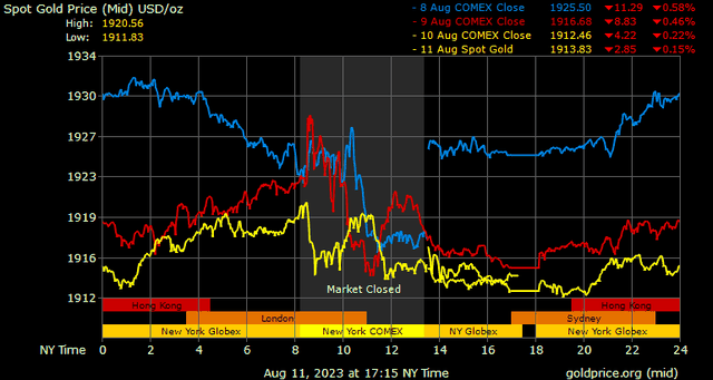 Trên thị trường vàng thế giới, giá vàng giao ngay chốt phiên cuối tuần tại Mỹ tăng nhẹ 1,3 USD lên 1.913,1 USD/ounce.