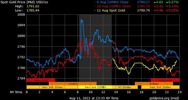 Giá vàng tương lai giao tháng 10/2022 trên sàn Comex New York giảm 6,5 USD xuống 1.796,8 USD/ounce.