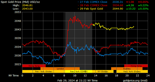 Trên thị trường vàng thế giới, giá vàng giao ngay chốt phiên hôm qua tại Mỹ tăng 9,8 USD xuống 2.044,3 USD/ounce. Sang phiên châu Á sáng nay, giá vàng tiếp tục tăng nhẹ 0,6 USD lên 2.044,9 USD/ounce.