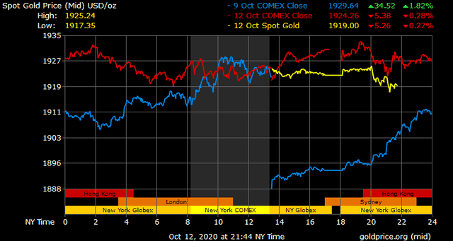 Trên thị trường vàng thế giới, giá vàng giao ngay chốt phiên đêm qua tại Mỹ giảm 8,7 USD xuống 1.921,9 USD/ounce. Sang phiên châu Á sáng nay, giá vàng giảm nhẹ xuống gần 1.918 USD/ounce. Giá vàng tương lai giao tháng 11 trên sàn Comex New York giảm 6 USD lên 1.918,3 USD/ounce.