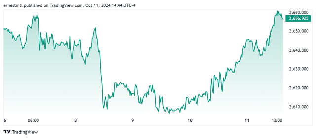 Giá vàng tương lai giao tháng 12/2024 trên sàn Comex New York tăng 37 USD, tương ứng tăng 1,4% lên mức 2.676,3 USD/ounce. Tính chung cả tuần, giá vàng giao ngay tăng 8,5 USD/ounce, tương ứng tăng 0,32%.