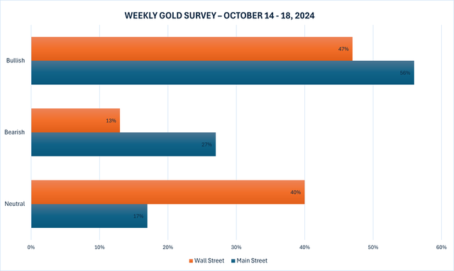 Tuần này, 15 nhà phân tích đã tham gia Khảo sát vàng của Kitco News, và một lần nữa, chỉ một số ít người ở Phố Wall thấy giá vàng tăng trong tương lai gần. Bảy chuyên gia, hay 47%, dự kiến ​​giá sẽ tăng trong tuần tới, trong khi hai chuyên gia khác, hay 13%, dự đoán giá kim loại quý này sẽ giảm. Sáu nhà phân tích còn lại, chiếm 40%, giữ thái độ trung lập về triển vọng gần của vàng.