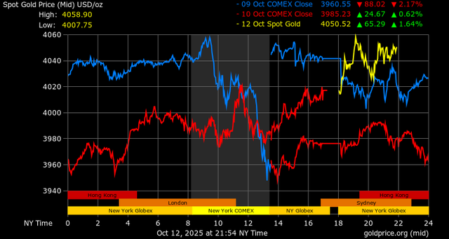 Trên thị trường vàng thế giới, giá vàng giao ngay chốt phiên cuối tuần qua tại Mỹ tăng 40,4 USD, tương ứng tăng 1,02% lên mức 4.016,7 USD/ounce. Sang phiên châu Á sáng nay, giá vàng tiếp tục tăng 33,8 USD lên 4.050,5 USD/ounce.