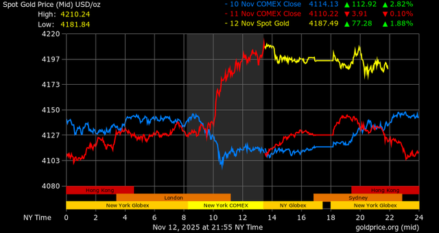 Giá vàng tương lai giao tháng 12/2025 trên sàn Comex New York tăng 97,3 USD, tương ứng tăng 2,36% lên mức 4.213,6 USD/ounce.