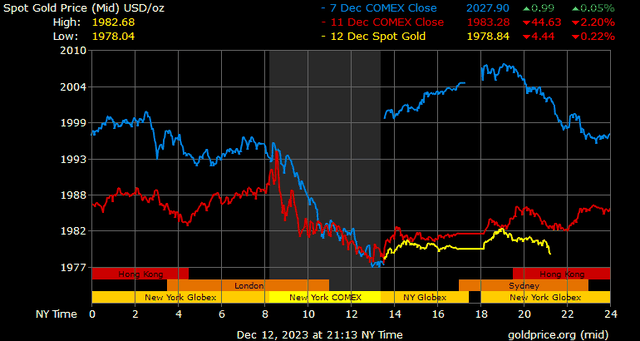 Giá vàng tương lai giao tháng 2/2024 trên sàn Comex New York giảm nhẹ 0,5 USD, tương ứng giảm 0,03% xuống 1.993,2 USD/ounce.