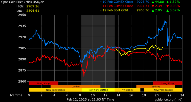 Trên thị trường vàng thế giới, giá vàng giao ngay chốt phiên hôm qua tại Mỹ tăng 6,3 USD, tương ứng tăng 0,2% lên mức 2.904 USD/ounce. Sang phiên châu Á sáng nay, giá vàng tiếp tục tăng nhẹ 2,5 USD lên 2.906,5 USD/ounce.