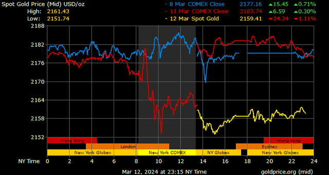 Trên thị trường vàng thế giới, giá vàng giao ngay chốt phiên hôm qua tại Mỹ giảm 24,3 USD xuống 2.158,5 USD/ounce. Sang phiên châu Á sáng nay, giá vàng đảo chiều tăng nhẹ 1 USD lên 2.159,4 USD/ounce.