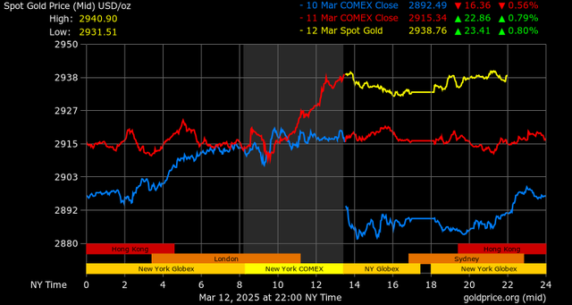 Trên thị trường vàng thế giới, giá vàng giao ngay chốt phiên hôm qua tại Mỹ tăng 17,9 USD lên mức 2.933,6 USD/ounce. Sang phiên châu Á sáng nay, giá vàng tiếp tục tăng 4,5 USD lên 2.938,1 USD/ounce.