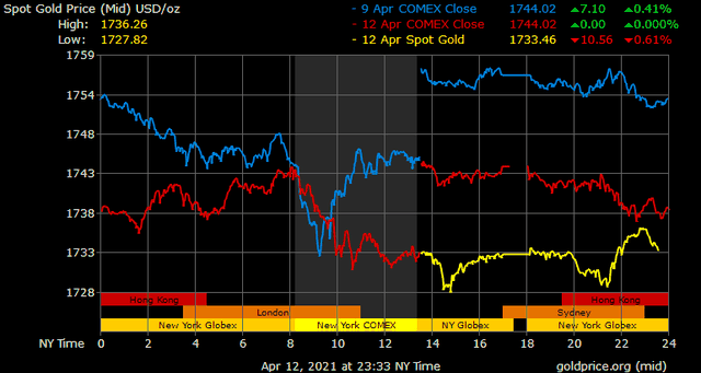 Trên thị trường vàng thế giới, giá vàng giao ngay chốt phiên đêm qua tại Mỹ giảm 11,5 USD xuống 1.732,7 USD/ounce. Sang phiên châu Á sáng nay, giá vàng hồi nhẹ, nhưng sau đó cũng đã yếu đi và về quanh 1.733 USD/ounce.