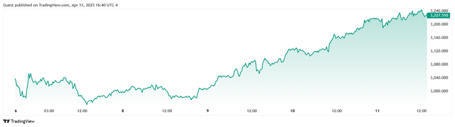 Giá vàng tương lai giao tháng 6/2025 trên sàn Comex New York tăng 67,1 USD, tương ứng tăng 2,11% lên mức 3.244,6 USD/ounce. Tính chung cả tuần, giá vàng giao ngay tăng 209,2 USD/ounce, tương ứng tăng 6,89%.